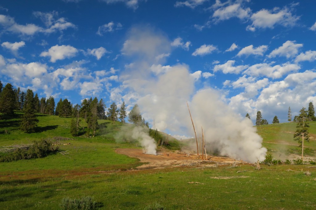 Naslednja postaja je bil Yellowstone National Park. Ker je bilo od zadnjega kampa do parka več kot 8 ur vožnje, sva prvi dan prespala pred parkom v Bridger-Teton National Forest v kampu Atherton Creek. Naslednji dan sva se že zgodaj zjutraj odpravila proti parku, da sva dobila prostor v kampu. V Yellowstonu sva nato tri noči kampirala v Lewis Lake Campground. Park se razteza na skoraj 9000 km2, večino tega pa predstavlja neokrnjena narava z iglastimi gozdovi in mnogimi rekami. Park je najbolj znan po gejzirjih (najslavnejši je Old Faithful) in bizonih, ki se večinoma nahajajo v Hayden Valley-u.
