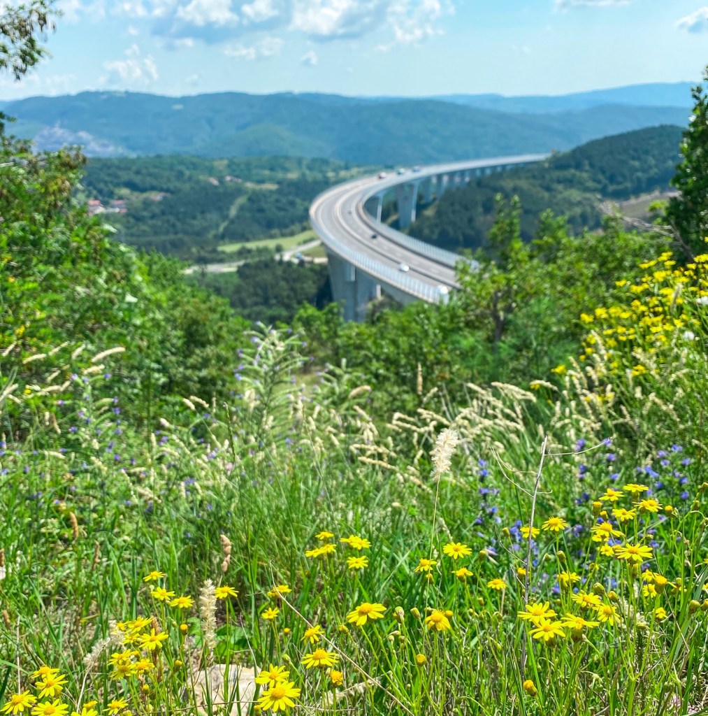 Pot naju je vodila do Črnega Kala. Najprej sva se ustavila na razgledišču pri peskokopu, kjer se lepo vidi viadukt in avtocesta.