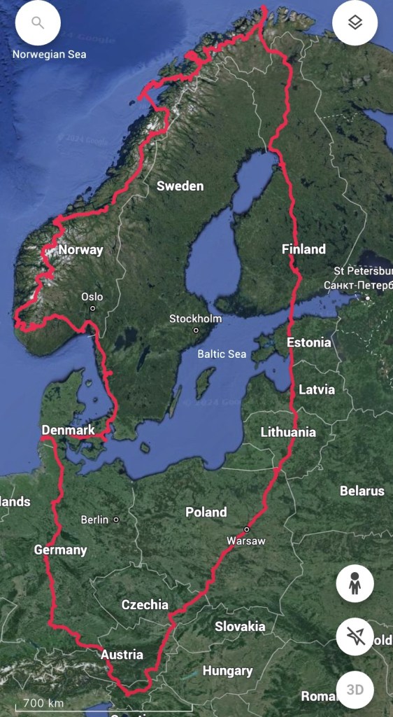 Tale objava pa bo zajemala načrt poti po dnevih, da boste lažje načrtovali svoje potovanje na sever Evrope. Midva sva imela na voljo 35 dni in v tem času sva prevozila 10 458 km. Največ časa sva se zadržala na Norveškem (tri tedne), ostale dni pa sva potovala po Finski, Švedski in Danski. Avstrija, Češka, Poljska, Litva, Latvija, Estonija in Nemčija pa so bile tranzitne države.